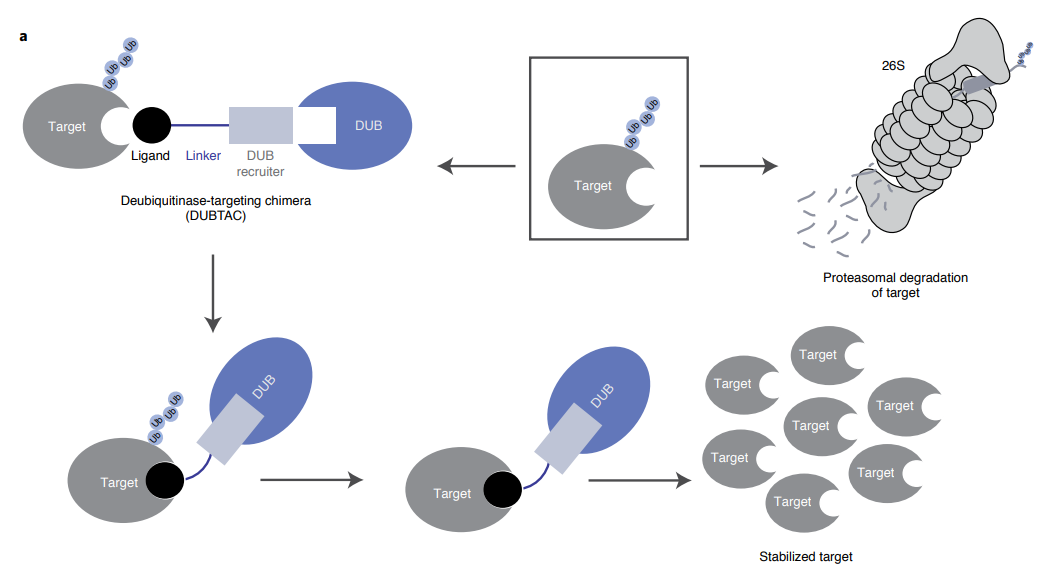Vicinitas的靶向去泛素化酶嵌合体(DUBTAC)平台最初由诺华生物医学研究所与加州伯克利大学合作开发。当蛋白质被泛素链所标记时,会被细胞中的蛋白质降解系统识别并消除。DUBTAC平台可以通过移除特定蛋白质上的泛素链来避免蛋白质降解,并稳定其含量以达到治疗目的。此平台生成由靶向蛋白的配体与去泛素化酶(DUB)募集子连接形成的双功能小分子。它们可以将去泛素化酶募集到那些被泛素标定的蛋白附近,以促进蛋白质上的泛素链移除,进而避免蛋白质的降解。