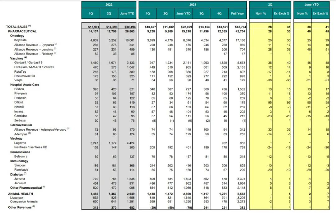 7月28日,默沙东发布2022Q2财报,上半年总收入304.94亿美元,扣除汇率影响同比增长41%。其中,Q2实现收入160亿美元,同比增长28%,扣除新冠药物莫奈拉韦(LAGEVRIO)和汇率影响,同比增长20%。上半年,默沙东制药业务收入268.63亿美元,同比增长45%,其中中国区接近25亿美元,同比增长51%。