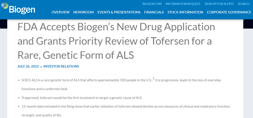 7月26日,渤健(Biogen)和Ionis pharmaceuticals共同宣布,FDA已接受其在研反义寡核苷酸疗法tofersen(BIIB067)的上市申请,用于治疗超氧化物歧化酶1 (SOD1)突变所致的肌萎缩侧索硬化(ALS)。FDA同时授予其优先审评资格,PDUFA日期定于2023年1月25日。