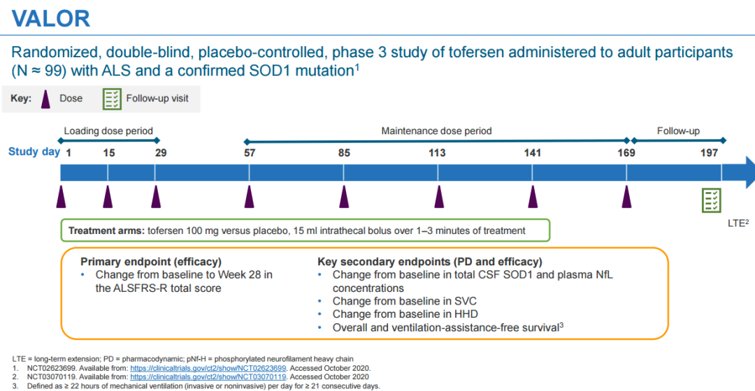 Tofersen的新药申请包括在健康志愿者中的I期临床试验、I/II期多剂量爬坡(MAD)临床试验、III期临床试验VALOR以及开放标签扩展 (OLE)的研究结果。同时也包含了最近12个月VALOR和OLE研究的整合结果,该研究最近在欧洲治愈ALS网络 (ENCALS) 年会上发表。 此前所公布的关键III期VALOR研究结果显示,其并未达到修订版肌萎缩侧索硬化功能评定量表 (ALSFRS-R)中从基线到第28周评分变化差异的主要终点。然而,生物活性和临床功能的多项次要和探索性终点分析显示疾病进展有减缓的趋势。近期公布的12个月整合性数据显示,早期使用tofersen可持续减少神经微丝(神经退行性疾病的生物标志物)数目,且减缓许多疗效终点的下降。