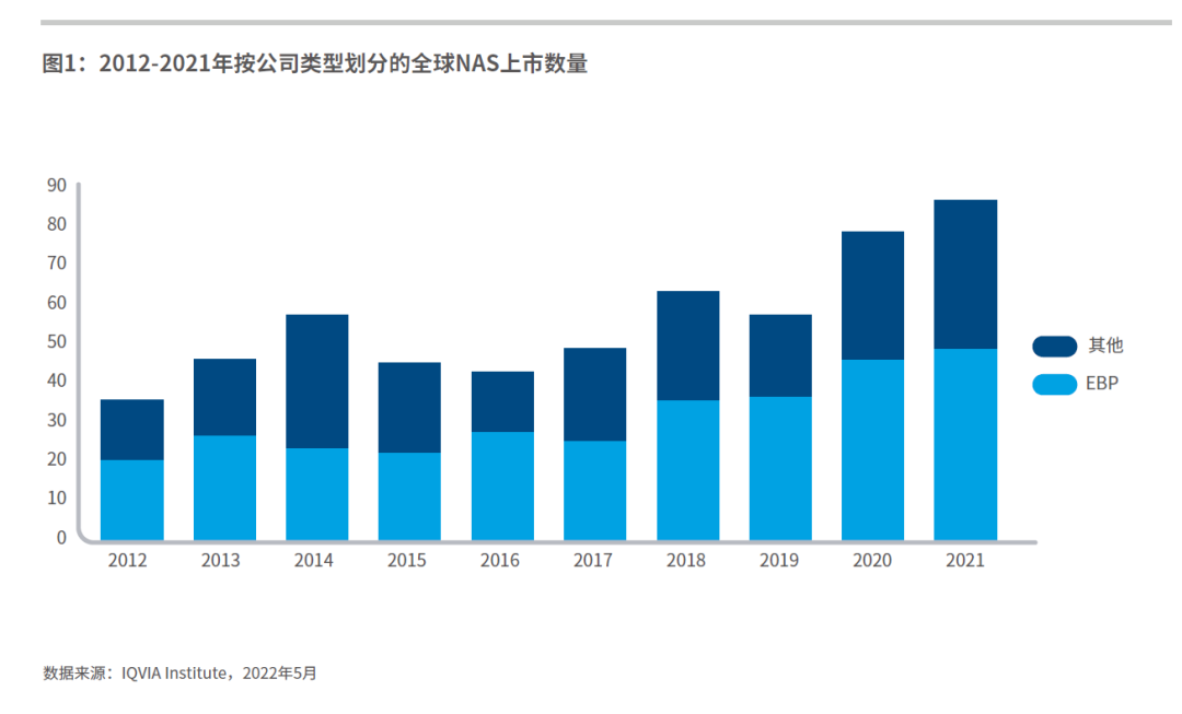 2021年,全球上市的新活性物质(NAS)数量创历史新高,达到85种;其中48种由新兴生物制药公司研发,同样创下历史新高。上市的NAS中,EBP研发产品所占比重一直保持相对稳定,十年来平均为56%,反映了这些公司持续不断地创新。