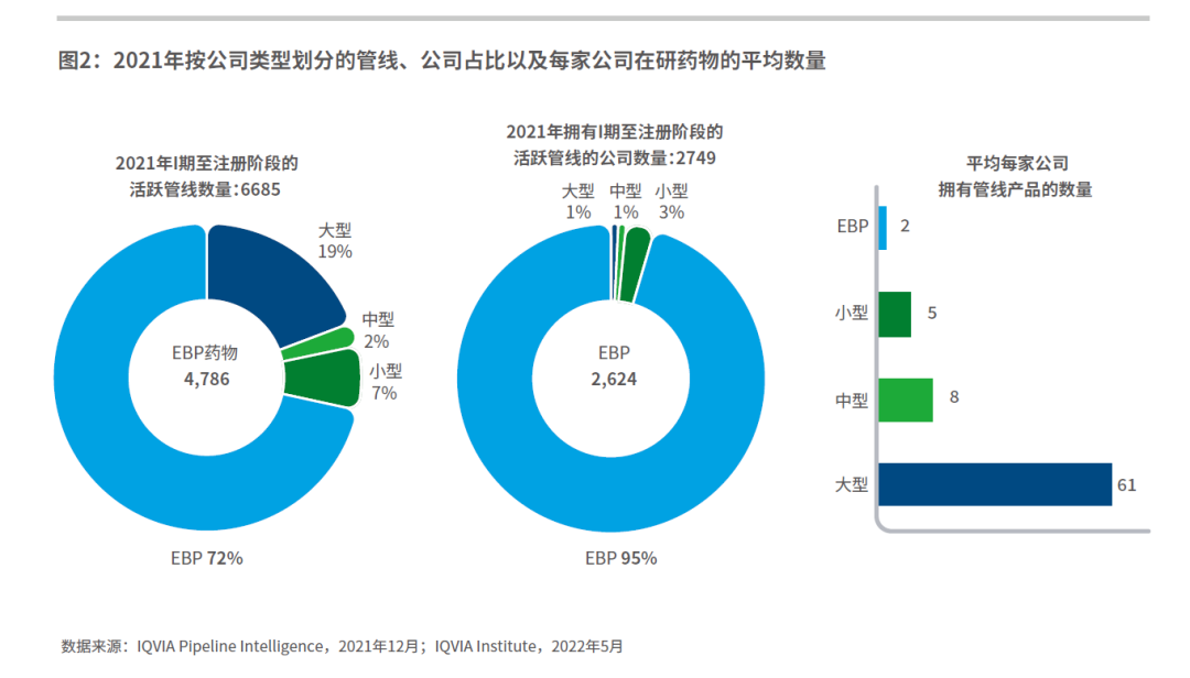 相较而言,大型制药公司目前占据19%的研发管线,但公司数量在所有参与研发公司中的占比不到1%,这反映了他们的“广撒网”战略,即从EBP公司和各种组合疗法中获得有前途的研究项目和技术。