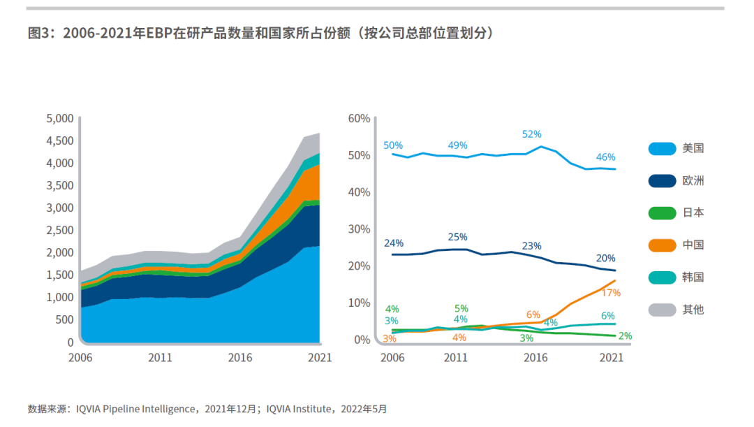 美国EBP研发的产品占管线的近五成,尽管份额近年来略有下降:从2016年的峰值52%下降到2021年的46%。
