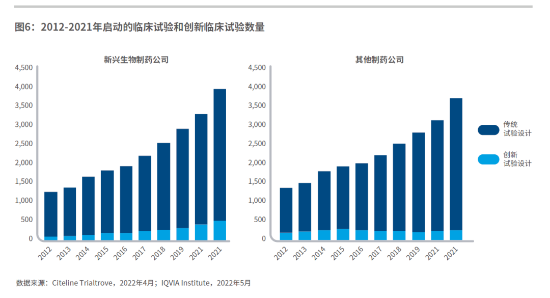 近年来,得益于灵活的监管,创新设计的应用日益增多,尤其是在罕见病或有重大未满足需求的疾病中。相比大型制药公司,新兴生物制药公司启动的创新性临床试验更多,而且这一趋势还在上升。