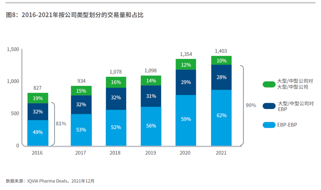过去五年,随着新兴生物制药公司参与交易增多,交易量一直在上升。2021年,新兴生物制药公司参与了90%的交易活动,高于五年前的81%。