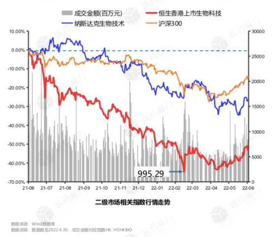 直到今年5月,二级市场的医药板块走势回升,一些参考指数如医药生物(申万)、恒生香港上市生物科技等,和近6个月的数据相比(截至6月30日),其近三个月的收益率均大幅缩窄,其中恒生香港上市生物科技指数更是由负转正。