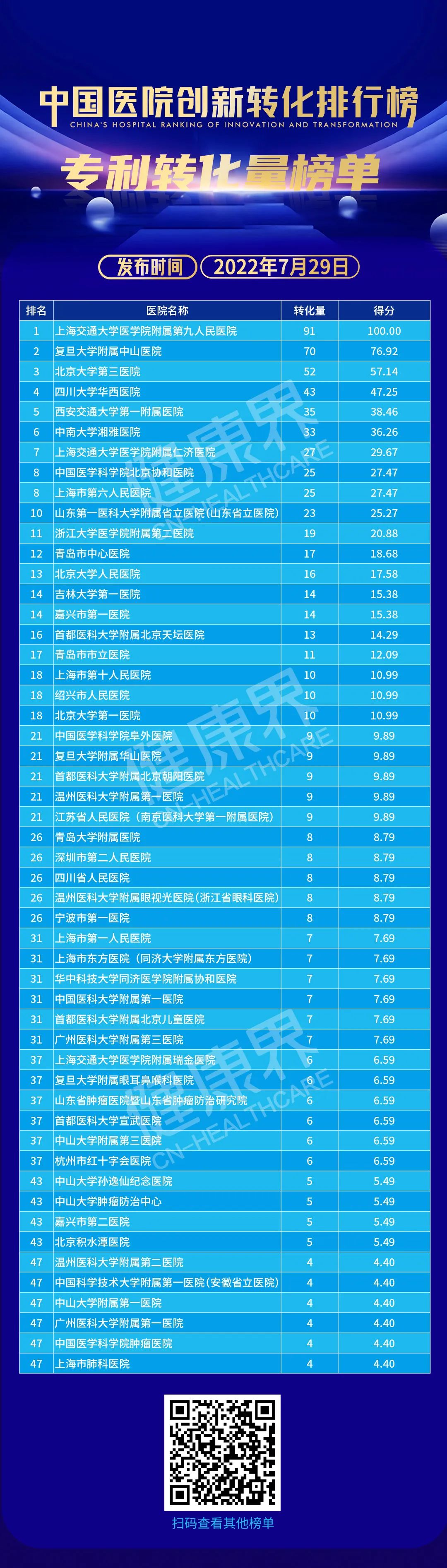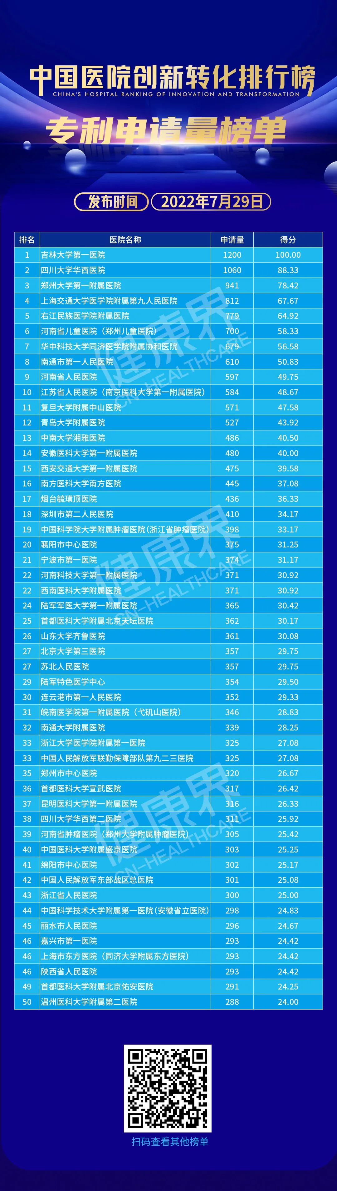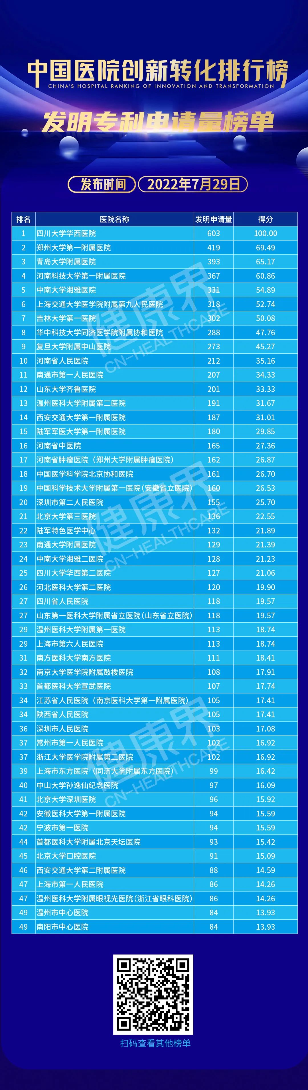 排行榜发布葛院士解读排行榜说,排行榜以专利为载体,以数据为基准,从专利申请量、专利授权量、发明专利申请量、发明专利授权量、PCT申请量、专利转化量六个维度,对全国三甲医院排名。「专利必须转化为人类幸福服务,没有转化的专利叫僵尸专利,排行榜把专利作为出发点是好的」。
