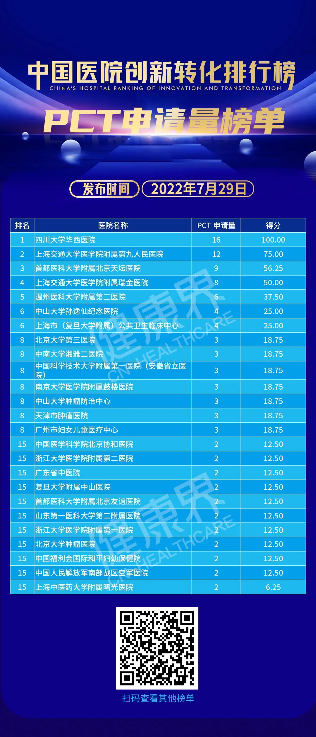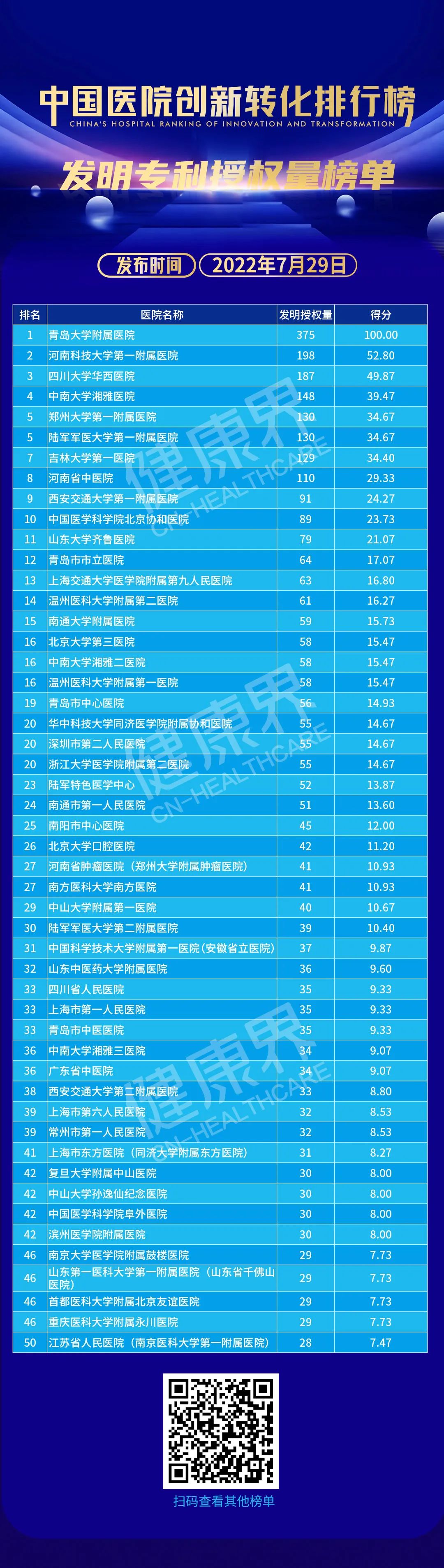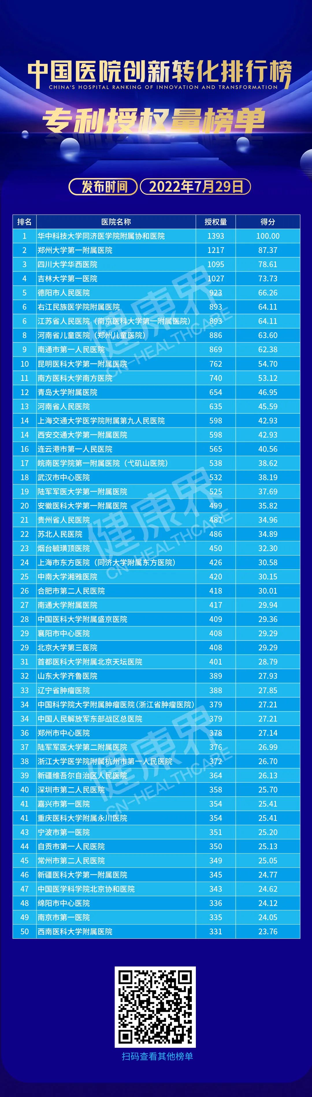 排行榜发布葛院士解读排行榜说,排行榜以专利为载体,以数据为基准,从专利申请量、专利授权量、发明专利申请量、发明专利授权量、PCT申请量、专利转化量六个维度,对全国三甲医院排名。「专利必须转化为人类幸福服务,没有转化的专利叫僵尸专利,排行榜把专利作为出发点是好的」。