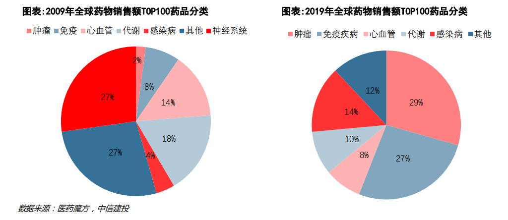 过去十几年,在临床需求强烈的背景下,自身免疫赛道展现出了惊人的销售爆发力。据医药魔方统计显示,2009年免疫疾病在全球药物销售额Top100中的占比仅有8%,到2019年这一占比大幅提升至27%,仅次于肿瘤领域。