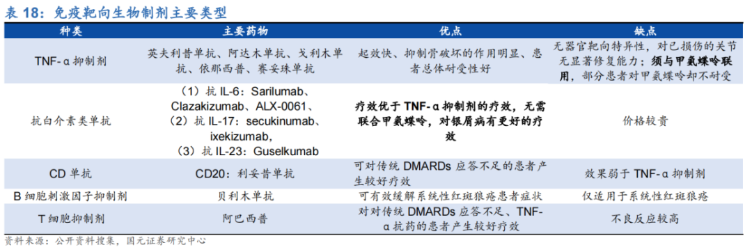 免疫靶向生物制剂,优点在于针对性强、疗效显著,但价格昂贵,该类药物包括TNF-α抑制剂、抗IL-17单抗、CD20单抗等。
