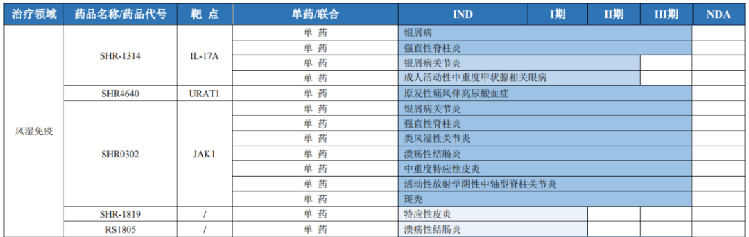 除此以外,恒瑞医药在风湿免疫领域布局了5款在研产品10多项适应症,而且临床进度多处于后期阶段。