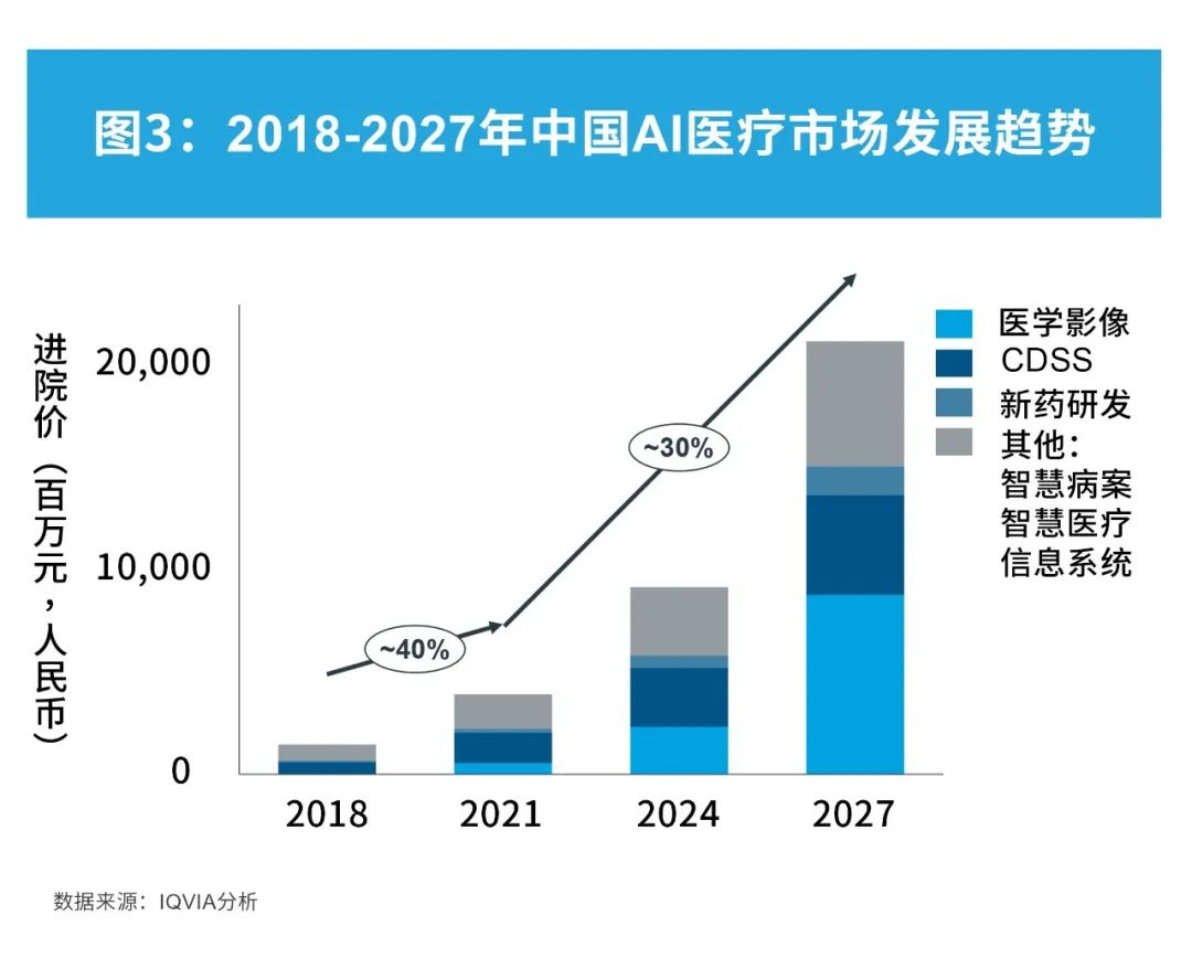 中国人工智能AI医疗市场在未来十年将持续快速增长,人工智能AI医学影像(包括X光、CT、病理、超声等)将成为增长最快的细分市场。