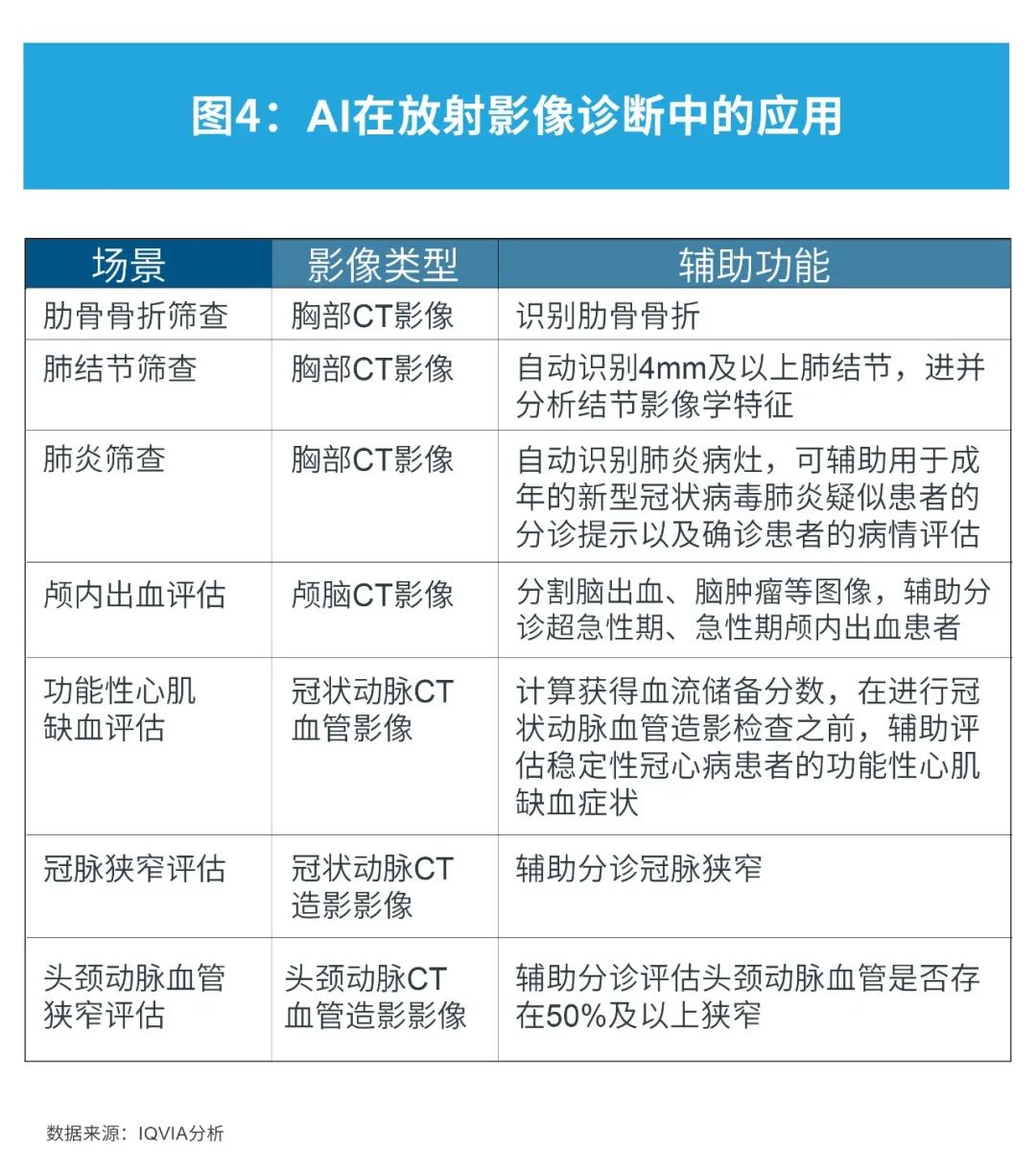 在放射医学影像领域,人工智能AI已被应用于筛查肋骨骨折、肺结节、肺炎,旨在消除漏诊,提升诊断效率;人工智能AI已应用于评估颅内出血、功能性心肌缺血、冠脉狭窄、头颈动脉血管狭窄,协助临床决策。
