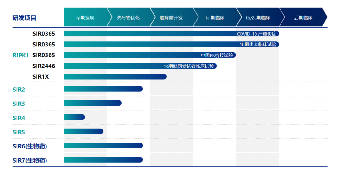 该公司由百济神州联合创始人王晓东博士和北京生命科学研究所资深研究员张志远博士联合创建。研究方向包括细胞程序性死亡、神经保护性通路和神经炎症。其主打疗法SIR0365是一款RIPK1抑制剂。RIPK1是一种丝氨酸/苏氨酸蛋白激酶,可调节多种生物信号转导通路,例如肿瘤坏死因子α介导的NFκB信号转导、细胞凋亡、细胞程序性坏死和炎症反应。