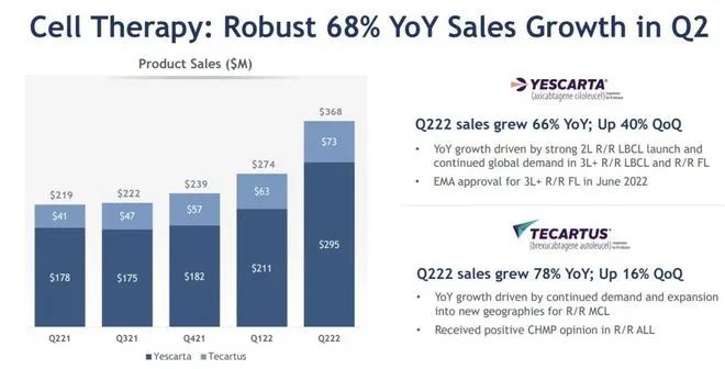 CAR-T疗法方面,Yescarta和Tecartus两款上市产品累计收入6.42亿美元,同比增长57%。其中Yescarta在2022年Q2增长66%,达到2.95亿美元;Tecartus则增长78%至7300万美元。在国内,Yescarta(阿基仑赛注射液)于2021年9月获批上市。