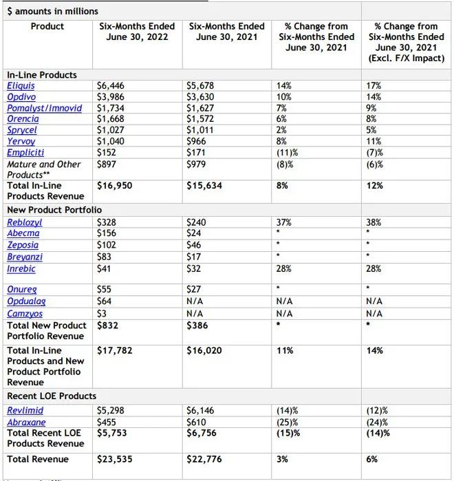 BMS在2022年上半年总收入235.35亿美元,其中Q2营收为119亿美元,同比增长2%。