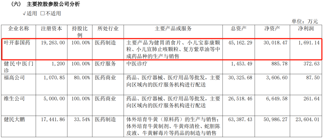 2022年中报显示,叶开泰国药为健民集团带来净利润1691.14万元,在健民集团主要控股参股公司中,排名第二。