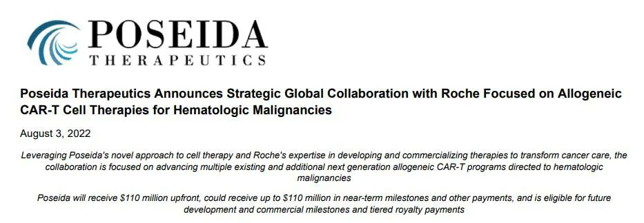 8月3日,Poseida Therapeutics宣布与罗氏达成全球战略性合作与许可协议,旨在共同开发针对多发性骨髓瘤、B细胞淋巴瘤及其他血液适应症的同种异体CAR-T疗法。