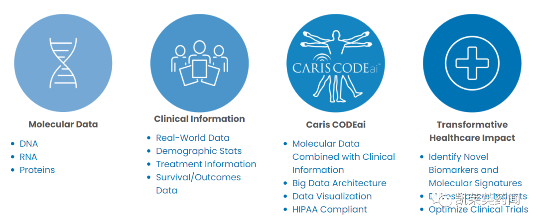 Caris Discovery 则是一个创新的端到端发现平台,它结合了公司独有的蛋白质组学分析平台 ADAPT 和公司专有的真实世界数据平台 CODEai, 对患者组织进行分子检测。将 Caris 广泛的分子数据目录与癌症治疗信息相结合,利用一套完全集成和专有的互补方法,识别与治疗方式无关的新靶标和验证现有靶标。ADAPT 生物靶向系统使用合成制造的分子(适配体)癌症特征库,这些分子与广泛的生物靶标结合,并在自然状态下表征复杂的生物系统,使他们能够系统地分析生物样本。CODEai 利用最先进的信息学系统和大数据架构,为更好地了解癌症的分子机制提供了无与伦比的资源。