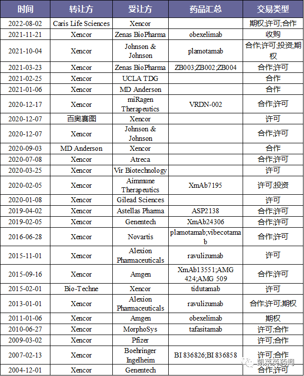 下表为Xencor近些年基于专有的双抗平台,开展的合作交易情况:
