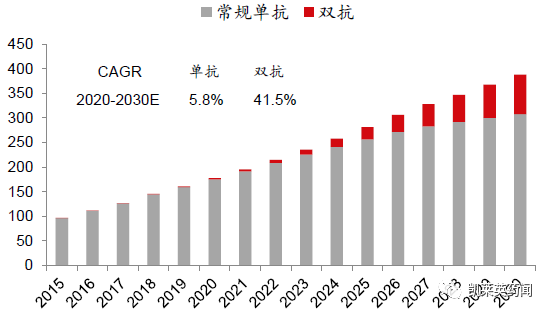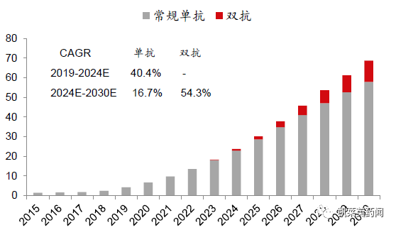 预计2030年中国的双抗市场达到108亿美元,2024-2030年增速54.3%;单抗市场规模579亿美元,2024-2030年增速16.7%。双抗行业增速高于单抗。