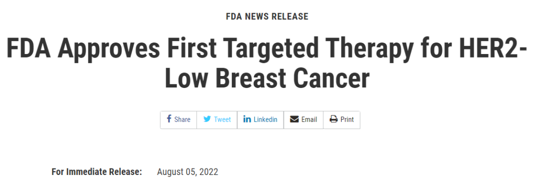 美国当地时间2022年8月5日,FDA批准了著名的ADC药物Enhertu (fam-trastuzumab-deruxtecan-nxki,DS-8201)通过静脉输液的方式治疗无法切除或转移性HER2低表达(HER2-low)乳腺癌患者。这是首个获批针对HER2低表达乳腺癌亚型患者的疗法,该亚型是新定义的HER2阴性乳腺癌亚型。