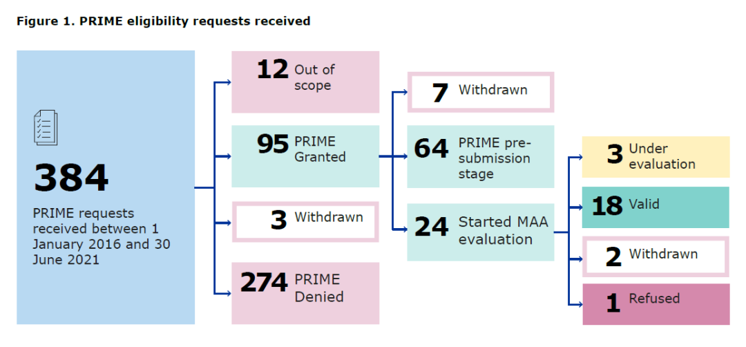 从2016年到2021年6月30日,EMA总计收到384份PRIME申请,95份申请获得批准。