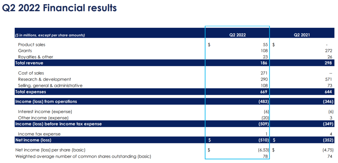 2022年8月8日,Novavax发布二季度财报,营业收入1.86亿美元,其中新冠重组蛋白疫苗NVX-CoV2373的销售额为5500万美元,销售成本2.71亿美元,研发投入2.9亿美元,二季度净亏损5.1亿美元。