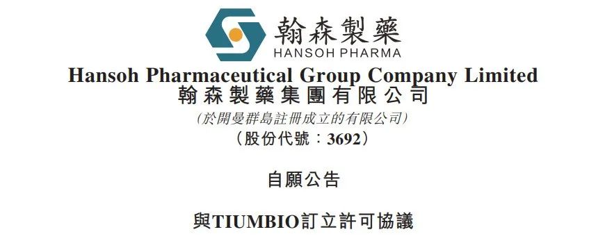 8月8日,翰森制药公告宣布,其全资附属公司翰森(上海)健康科技有限公司及江苏豪森药业集团有限公司(统称为被许可人)与TiumBio订立独家许可协议。