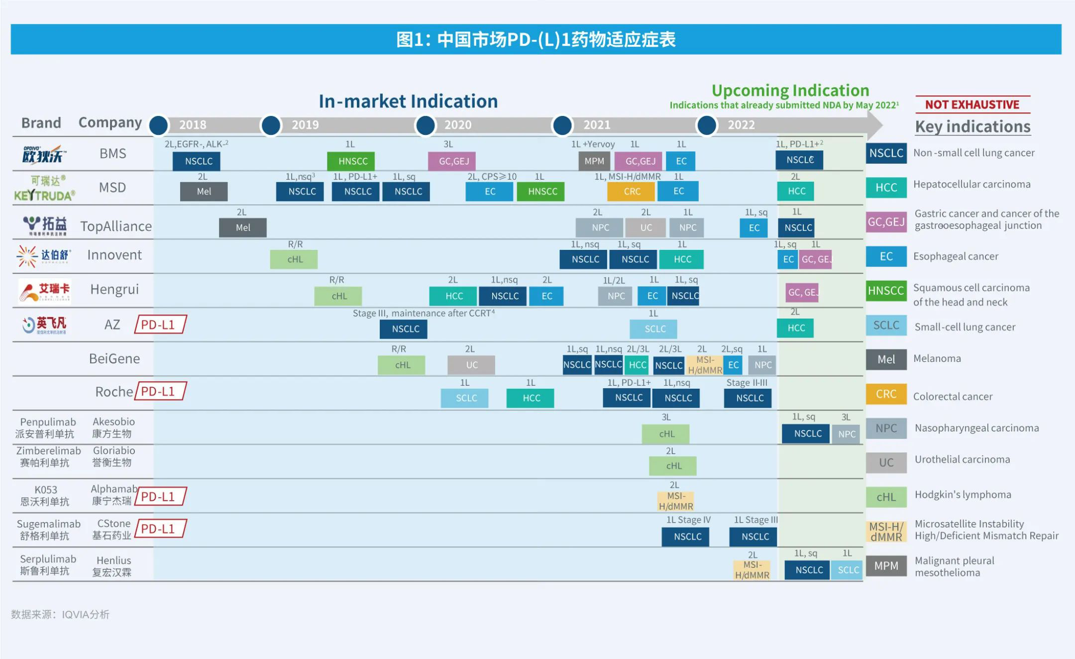 在中国,继2018年O药和K药相继获批以来,截至2022年6月,已有13款PD-(L)1类产品上市,其中9个PD-1、4个PD-L1,涉及11个瘤种和相关的泛瘤种。中国的PD-(L)1药物市场,除了外资药企群雄逐鹿外,国内药企包括信达生物、恒瑞医药、百济神州、君实生物、康方生物、誉衡生物、复宏汉霖、基石药业、康宁杰瑞/思路迪/先声药业均有PD-(L)1产品参与角逐,竞争环境激烈。