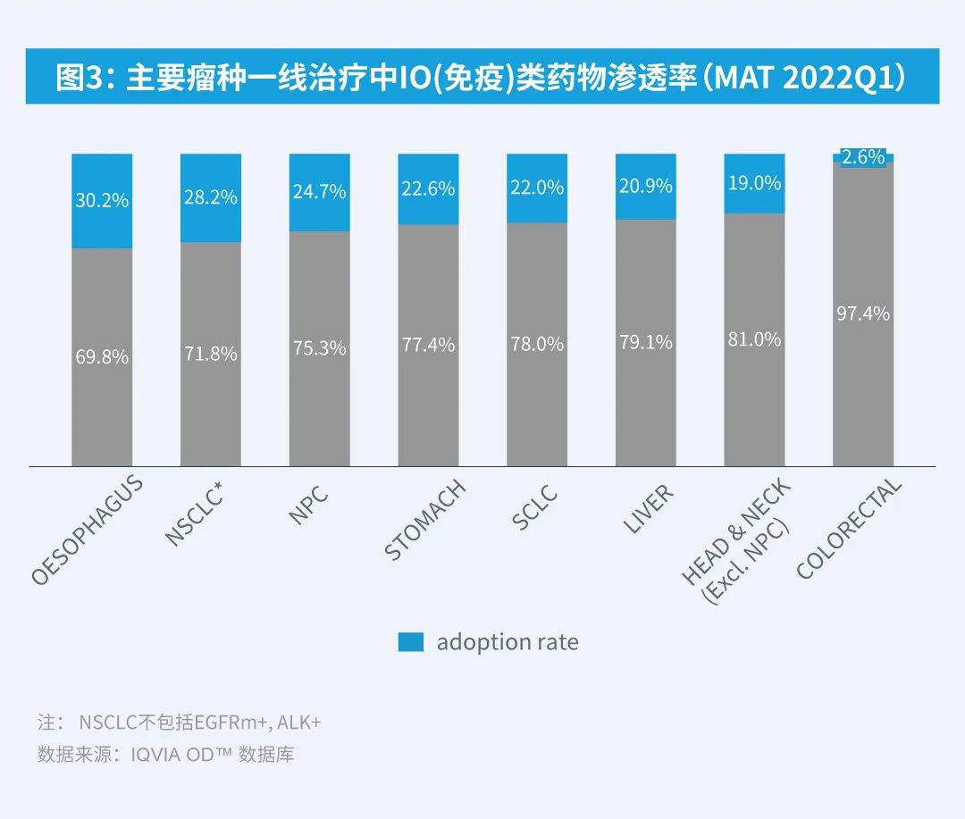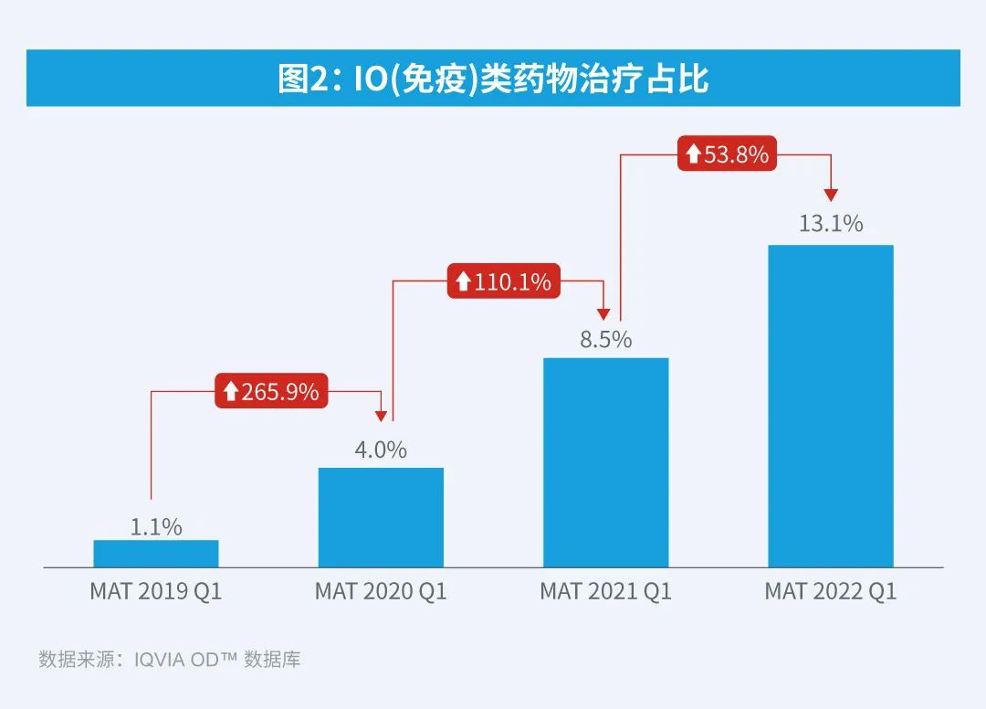 IQVIA Oncology Dynamics™数据库(下简称OD数据库)在2018年Q1捕捉到第一例PD-(L)1药物临床应用病例。IQVIA OD 数据显示, MAT* 2022 Q1,经IO(免疫)类药物治疗的患者,占到所有经药物治疗的肿瘤患者(包括晚期治疗、新辅助治疗、辅助治疗)的13.1%,过去两年的患者份额占比增长率分别为110.1%和53.8%。