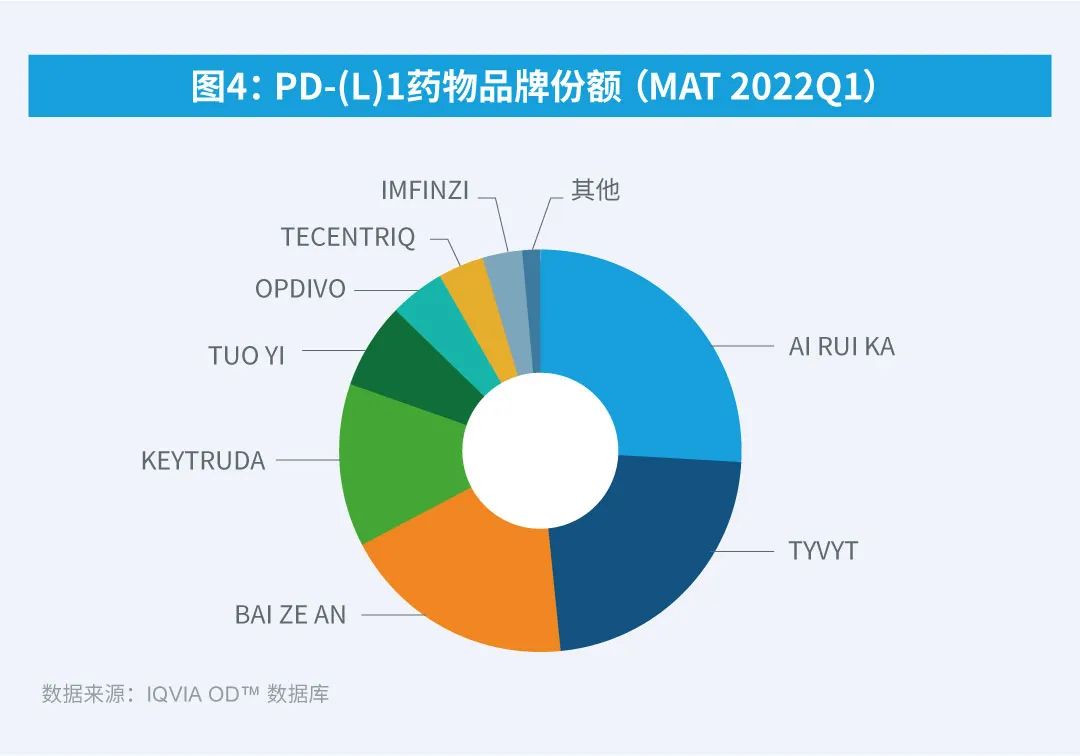 在所有PD-(L)1品牌中,目前总体市场份额最高的是艾瑞卡,随后依次是达伯舒,百泽安,K药和O药位居第4和第6。其中,百泽安增长显著。