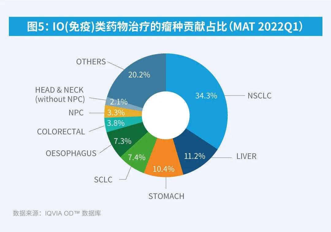 就各肿瘤领域看,目前非小细胞肺癌仍然是IO(免疫)类药物最主要的市场,占所有IO(免疫)类药物治疗的34.3%,实际临床在用的品牌数量超过10个;随后分别是肝癌,占11.2%,胃癌,占10.4%。