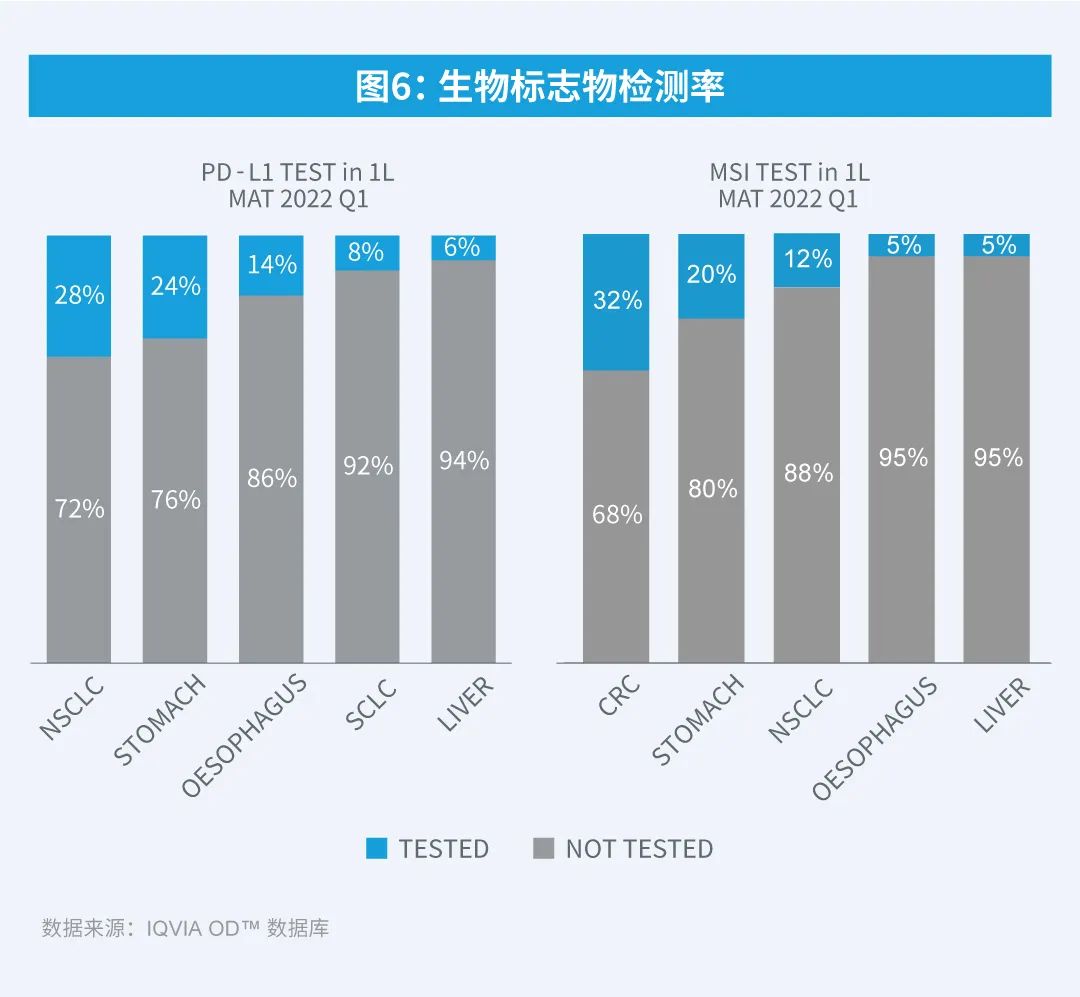 随着生物标志物检测技术和治疗指导意义的认知发展,目前PD-(L)1检测已经在主要PD-(L)1类药物涉及的瘤种领域中,有相当的检测比率,比如在非小细胞肺癌晚期一线中达28%,胃癌一线为24%,食管癌一线为14%。MSI(微卫星不稳定)在结直肠癌晚期一线中有32%的检测率,胃癌一线为20%。MMR(错配修复)等相关生物靶点的检测,也达到一定的比例。
