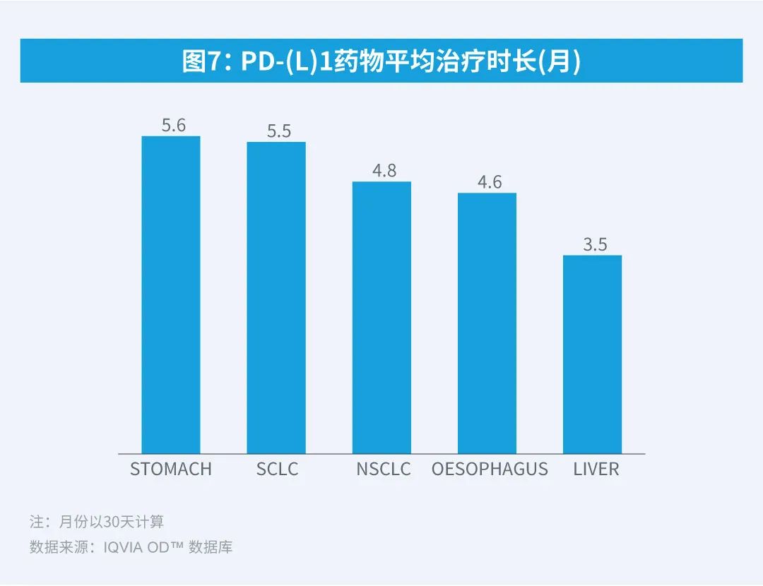 根据数据统计,以晚期一线为例,目前PD-(L)1类药物的平均治疗时长在各瘤种中,都超过3.5个月。胃癌和小细胞肺癌的治疗周期超过5.5个月,非小细胞肺癌达4.8个月,数据有待持续跟踪观察。