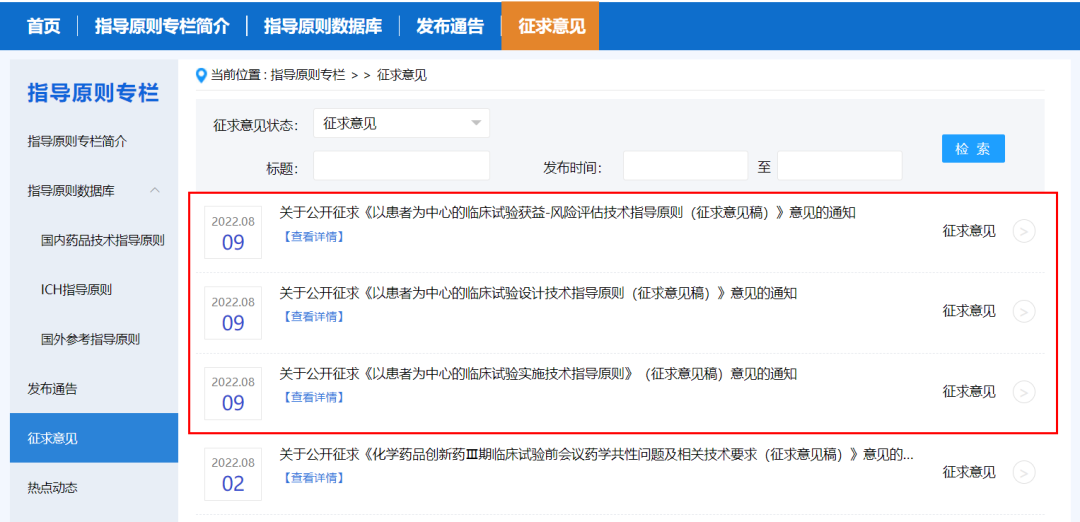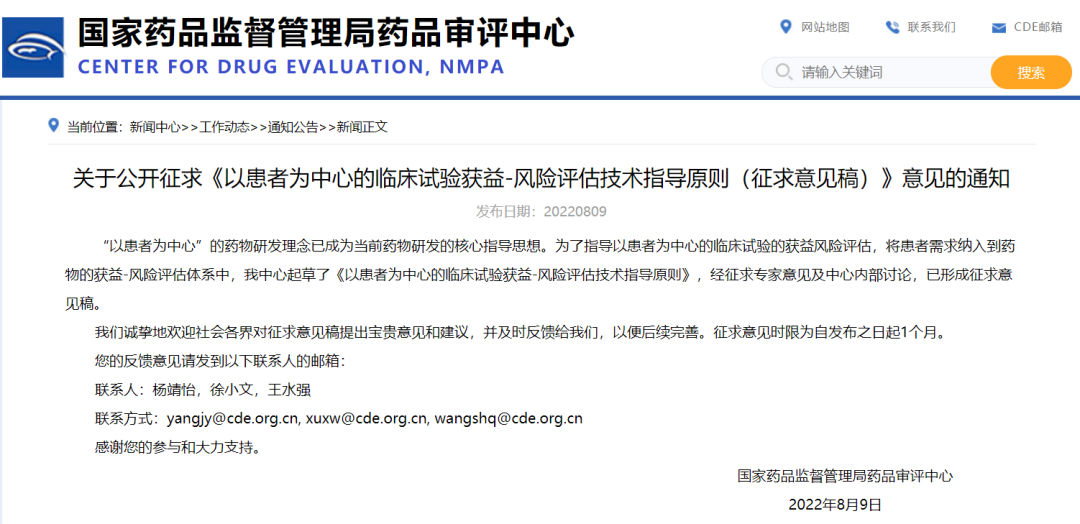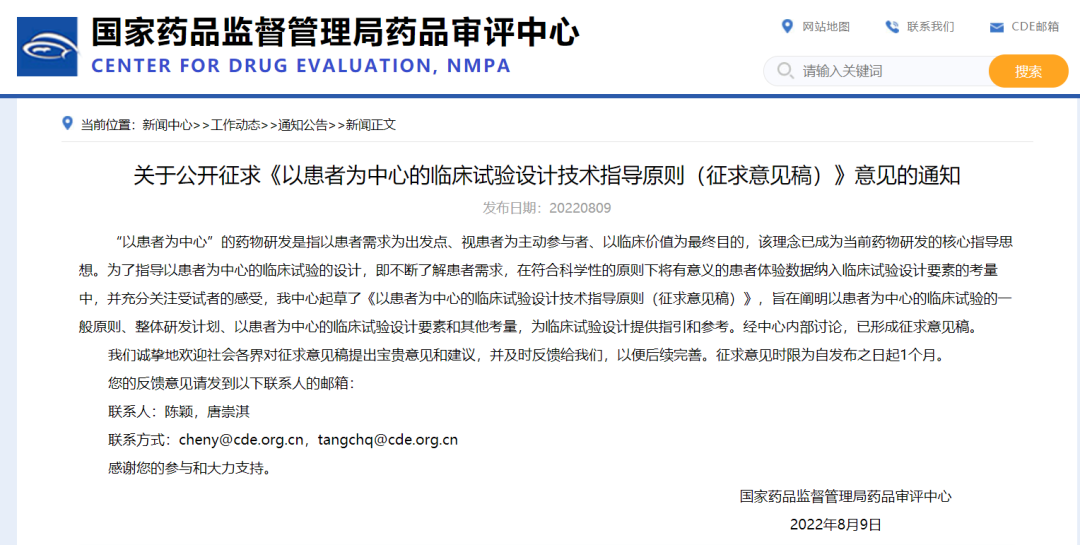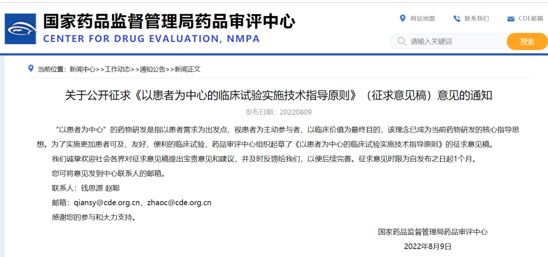 2022年8月9日,国家药品监督管理局药品审评中心(CDE)发布三份征求意见稿,均与“以患者为中心的临床试验”有关,分别为: