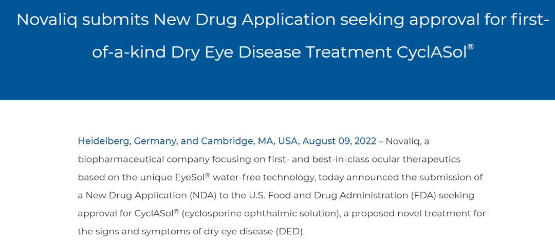 8月9日,Novaliq宣布,已向FDA提交CyclASol®(0.1%环孢菌素A制剂,SHR8028)的新药上市申请(NDA),用于治疗干眼症(DED)。