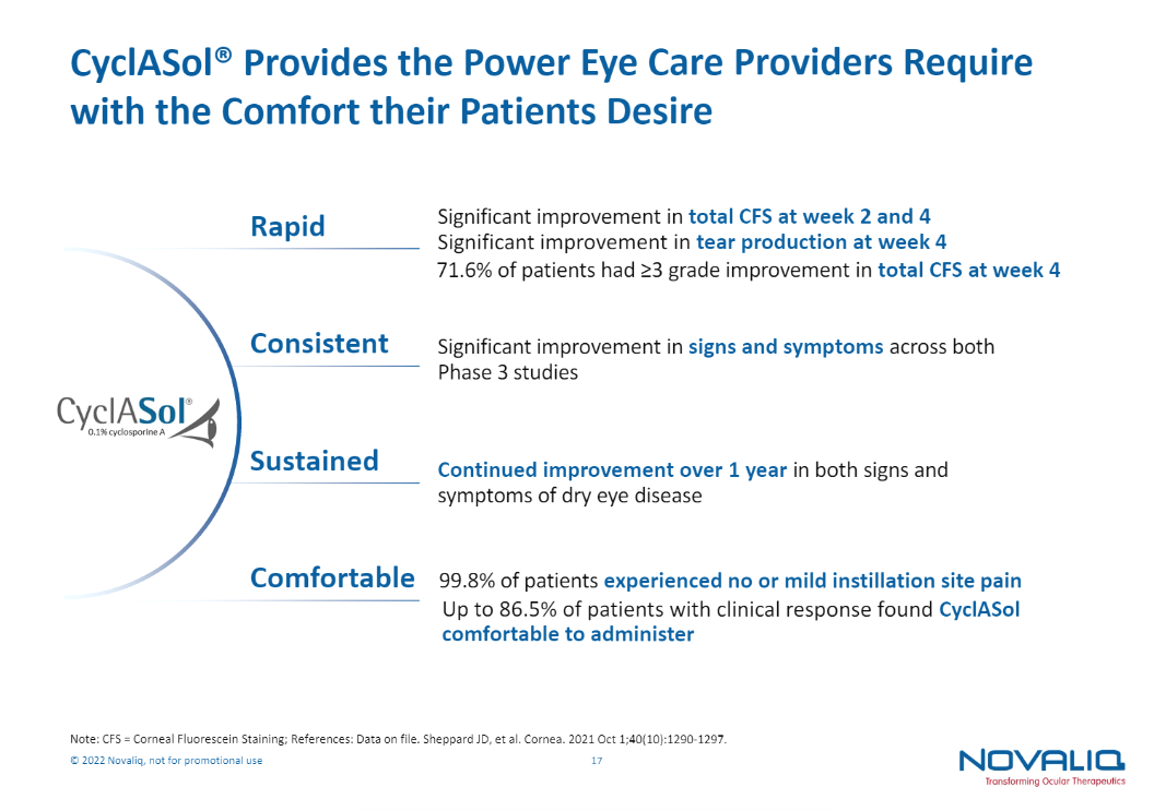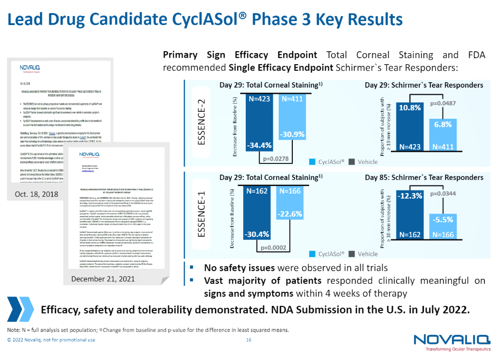 2021年12月,Novaliq宣布,CyclASol治疗干眼症的关键III期临床试验(ESSENCE-2)取得积极结果。研究结果显示,治疗29天,CyclASol在改善全角膜荧光素染色评分(tCFS)主要终点方面显著优于对照组(p=0.0278),71.6%接受CyclASol治疗患者达到响应,总体角膜染色改善≥3级。所有预设客观体征终点均显示出临床意义上的改善,与对照组显著统计学差异。安全性方面,试验所有不良事件(AE)的发生数量较低,通常为轻度。