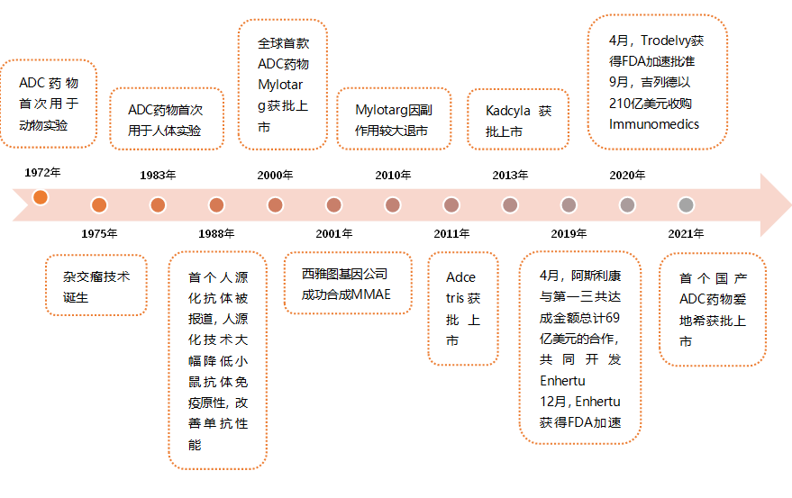 ADC(Antibody Drug Conjugate)是将细胞毒药物连接到靶向肿瘤的单克隆抗体而构成的复合体,其结合了靶向药物和化疗药物的特点,可实现精准治疗。ADC 药物的概念早在1900 年就被提出,然而受技术限制长期停留于理论层面。1990-2000 年间,单抗药物获得广泛的临床应用,降低了开发ADC 药物的障碍。