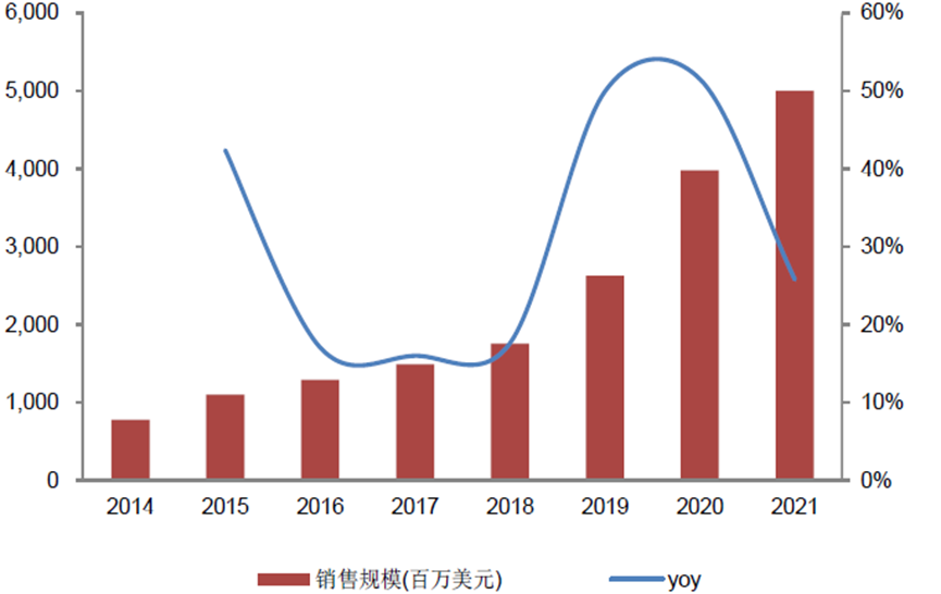 受益于ADC 药物逐步扩大的适应症以及优异的疗效,ADC 药物销售屡创佳绩。2021 年全球ADC 销售额近50 亿元美元,2014-2021 年均复合增长率约30%。Adcetris 于2011 年获批,2021 年全球销售约12.7 亿美元。Kadcyla 于2013 年获批,2021 年全球销售额约21.3 亿美元。新一代ADC 药物未来增长潜力巨大,Enhertu、Padcev 均于2019 年获得FDA 批准上市,2021 年销售额分别为5 亿和3.4 亿美元,《Nature》预计上述两款药物2026 年销售分别将达到62 亿美元和35 亿美元。