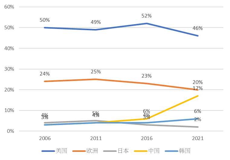 2006年-2021年,90%的新兴生物制药公司的研发活动主要集中在美国、欧洲、中国、日本和韩国这5大国家/区域,其中中国新兴生物制药公司的研发管线自2016年暴涨456%,在2021年全球研发管线占比达到17%(如图1所示),发展势头强劲,对中国乃至全球创新药研发贡献力量。