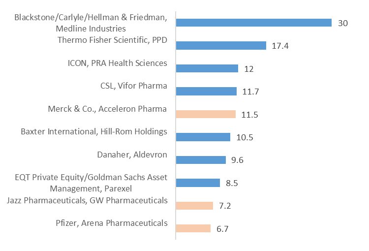 图2 2021 年十大收购交易总额排名(按交易总价值,单位:10 亿美元)(图片来源:IQVIA Institute)