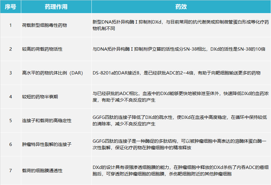而DS-8201是由阿斯利康和第一三共合作开发推广的一种新型靶向HER2的ADC药物。由人源化抗HER2 IgG1抗体、可裂解的GGFG四肽连接子和拓扑异构酶I抑制剂(喜树碱衍生物Dxd)组成,具备精准靶向和高效低毒的双重优势,主要药理作用如下:
