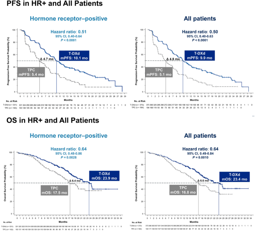 在HR+和总人群中,T-DXd组的中位无进展生存期(mPFS)分别为10.1和9.9个月,中位总生存期(mOS)分别为23.9和23.4个月,显著优于对照组。