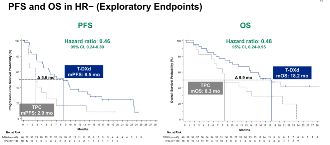 在HR-人群中,T-DXd组和TPC组的mPFS分别为8.5和2.9个月(HR=0.46);T-DXd组和TPC组的mOS分别为18.2个月和8.3个月(HR=0.48)。