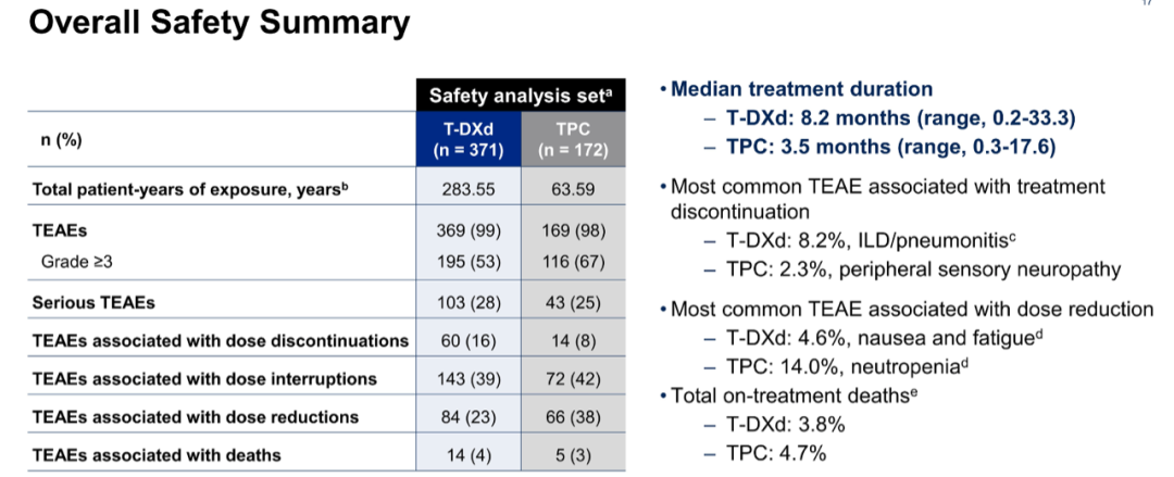 特殊药物相关不良反应,ILD/肺炎,T-DXd组和TPC组分别为12.1%和0.6%;左心室功能障碍,T-DXd组和TPC组分别为4.3%和0.5%。