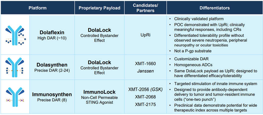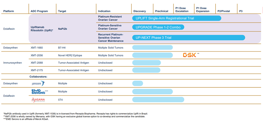 Mersana的早期项目包括XMT-1660(一种靶向B7-H4的Dolasynthen ADC)和XMT-2056。此外,多个合作伙伴正在使用Mersana的平台来推进他们的ADC管线。