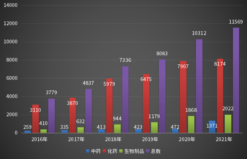 就承办受理号总量,从2016年申报3779个(以受理号计)到2021年的11569个,数量逐年攀升;其中2021年承办化药申请受理号8174个,与2020年的7907差别不大,生物药2022个,与2020年的1868个相差仅154个,同样无太大差异,但中药2021年申报较2020年的472有显著提升,为1371个,达到近6年中药申报数量的巅峰。