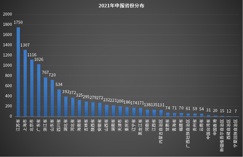 在各省市的药品申报方面,2021全年申报情况和2021上半年一致,江苏以1750遥遥领先,其次上海以1307屈居第二,随后依次为北京、广东、浙江。此外,中国台湾省药品申报数量(31项)高于宁夏、西藏等省份。2021年各省市申报情况见图3。