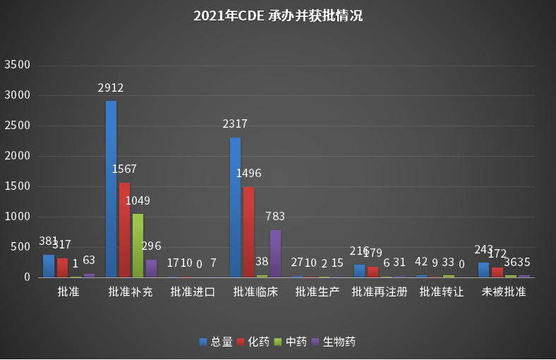 根据药智注册与受理数据库最新统计,2021年(注:CDE承办日期从2021年1月1日至2021年12月31日)审评完结受理号数量(指药智网中收录到审评结论的数量,不包括审评结束,但未公示审评结论的受理号)共计5414个,其中化药4414个,中药206个,生物制品792个。2021年承办并获批情况详见图6。